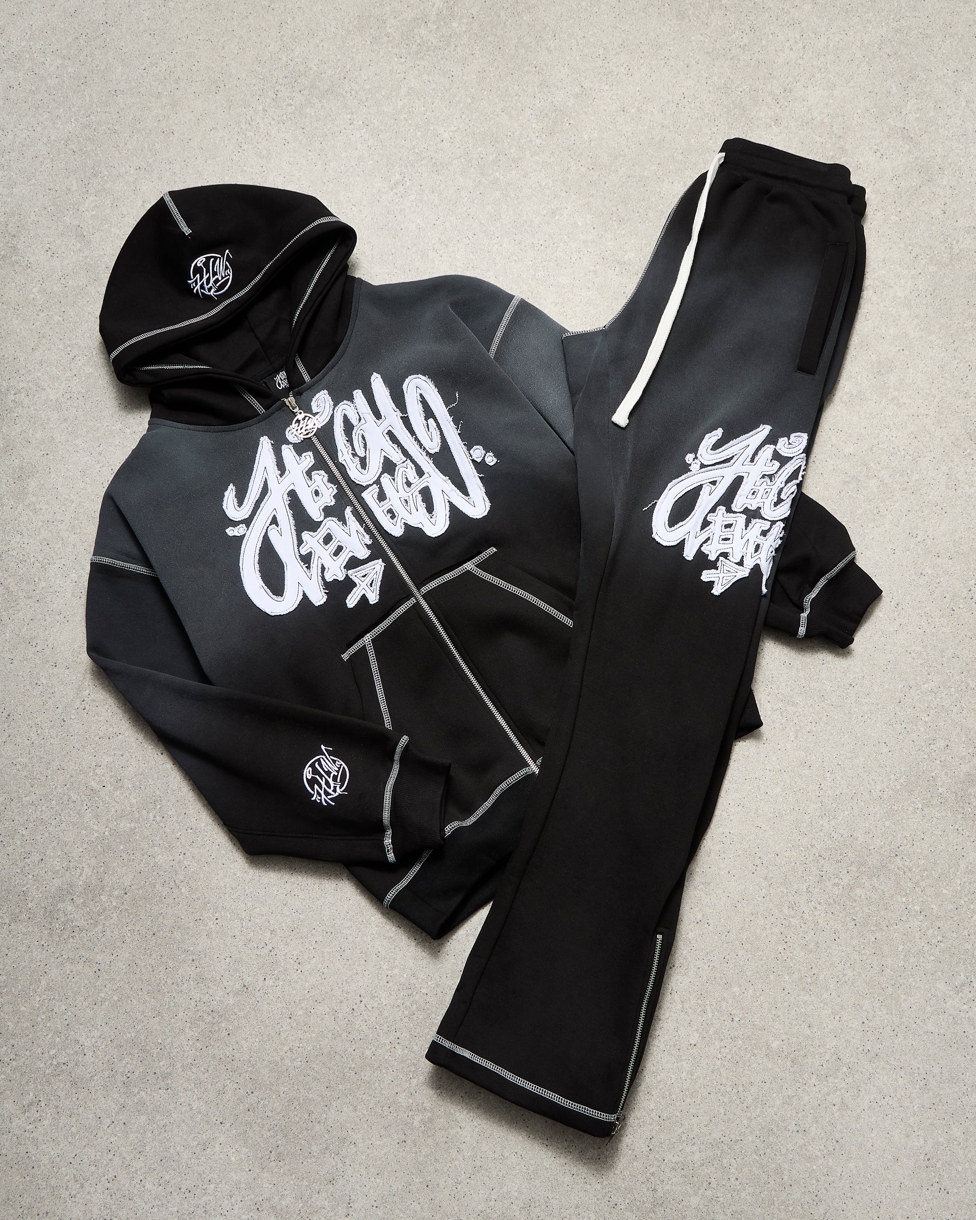 Stacked joggers with adjustable flared legs, distressed 3D embroidery, contrast stitching, and a sunwashed fade. Made from combed cotton fleece with a custom zipper for a relaxed, durable fit.