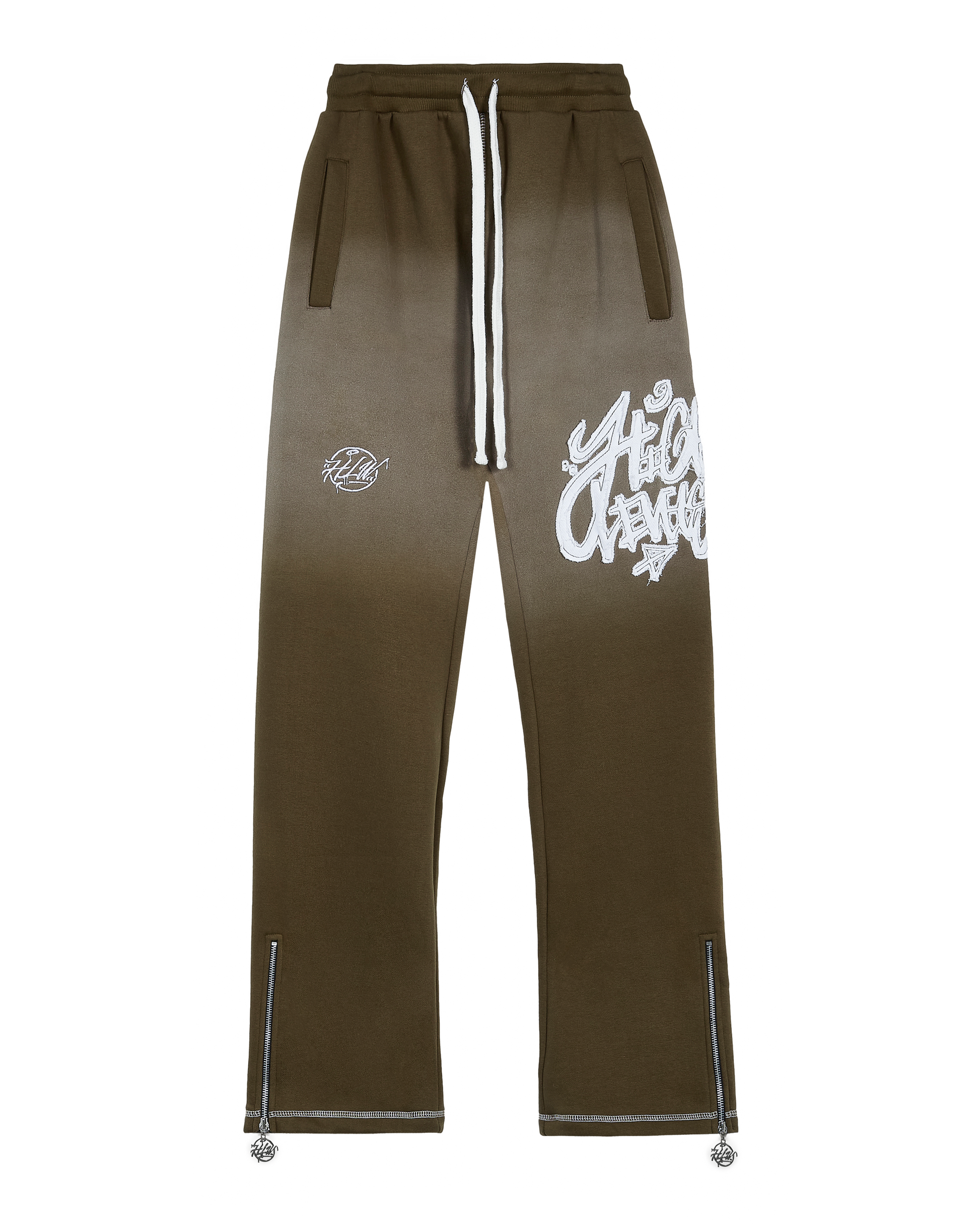 Stacked joggers with adjustable flared legs, distressed 3D embroidery, contrast stitching, and a sunwashed fade. Made from combed cotton fleece with a custom zipper for a relaxed, durable fit.