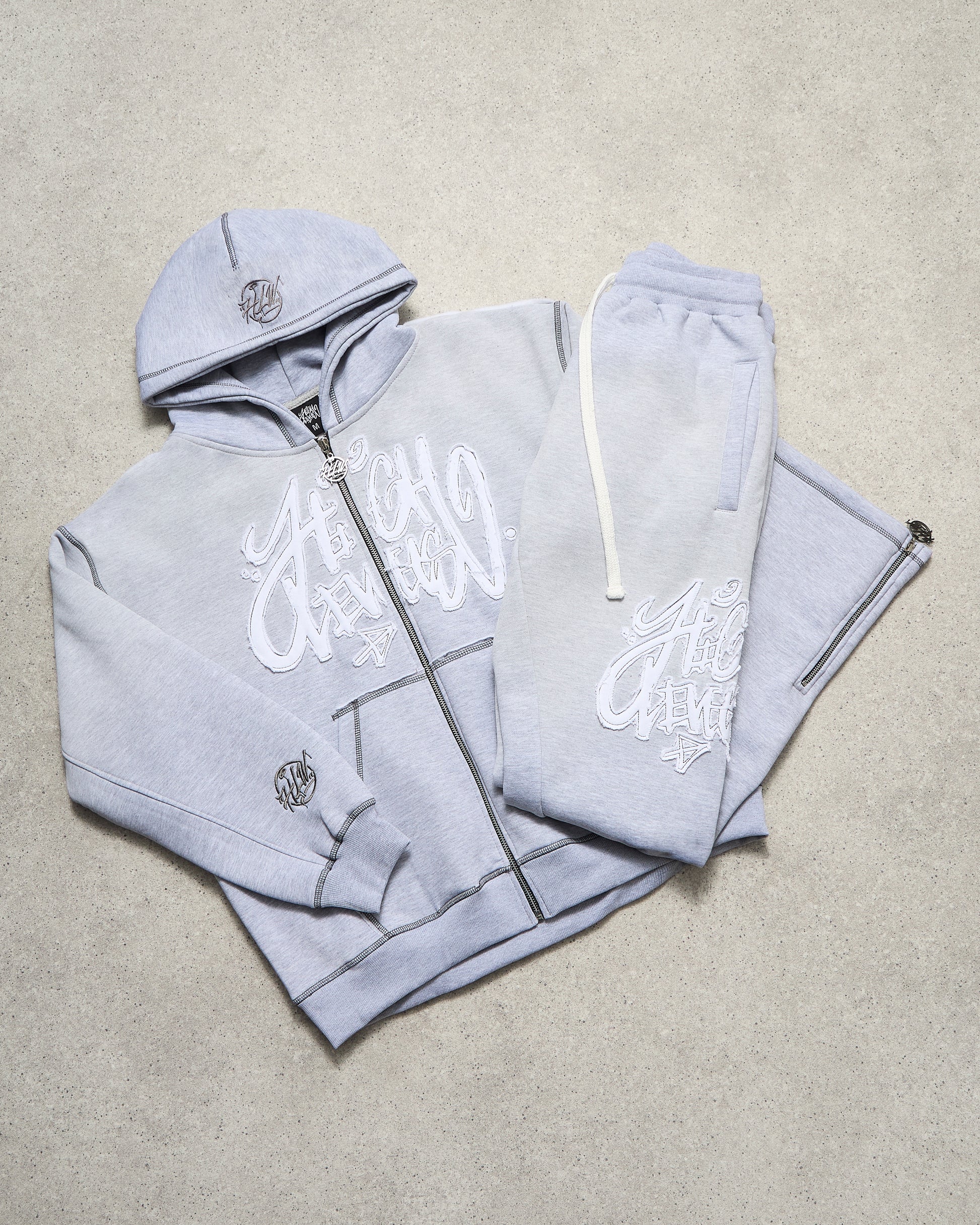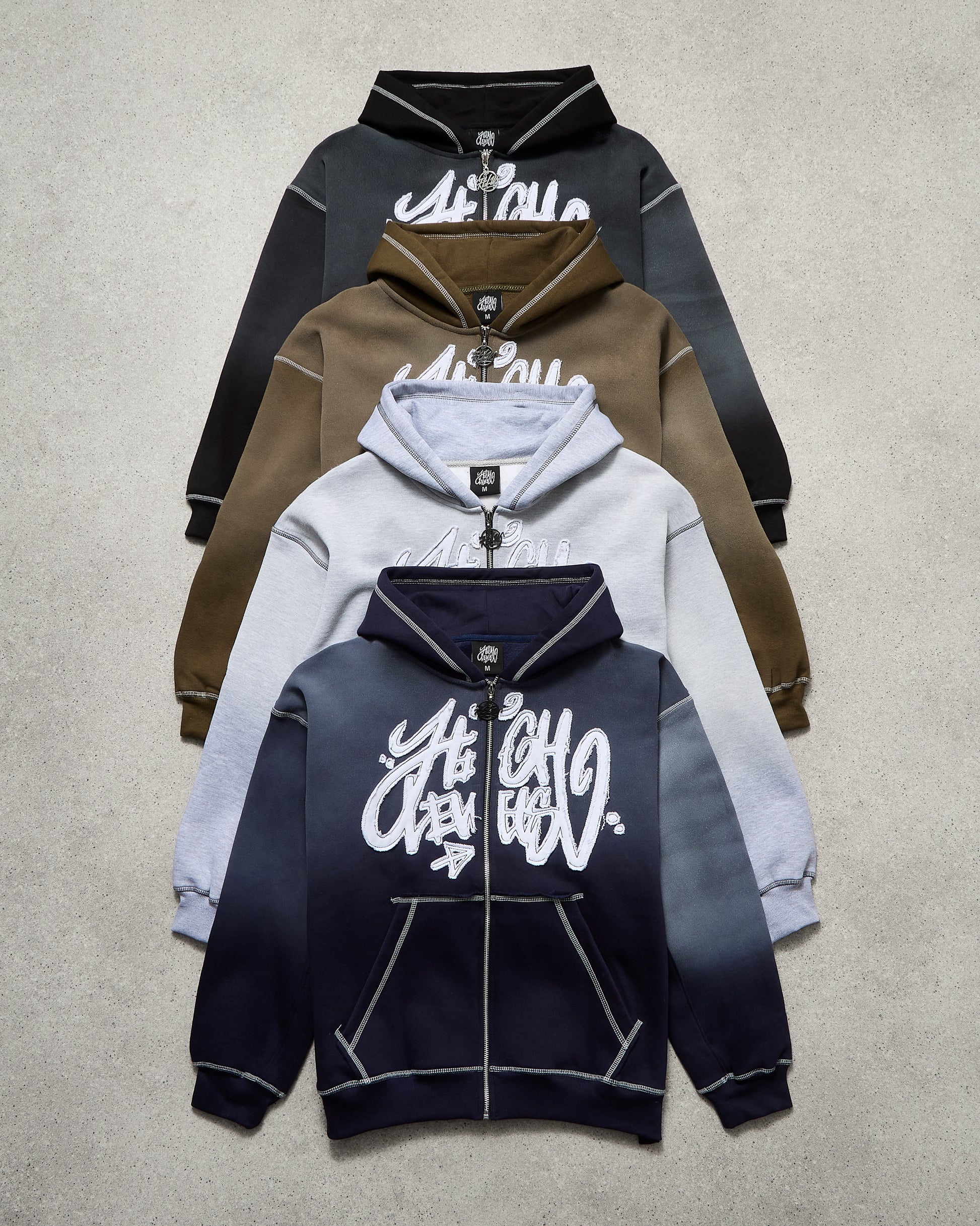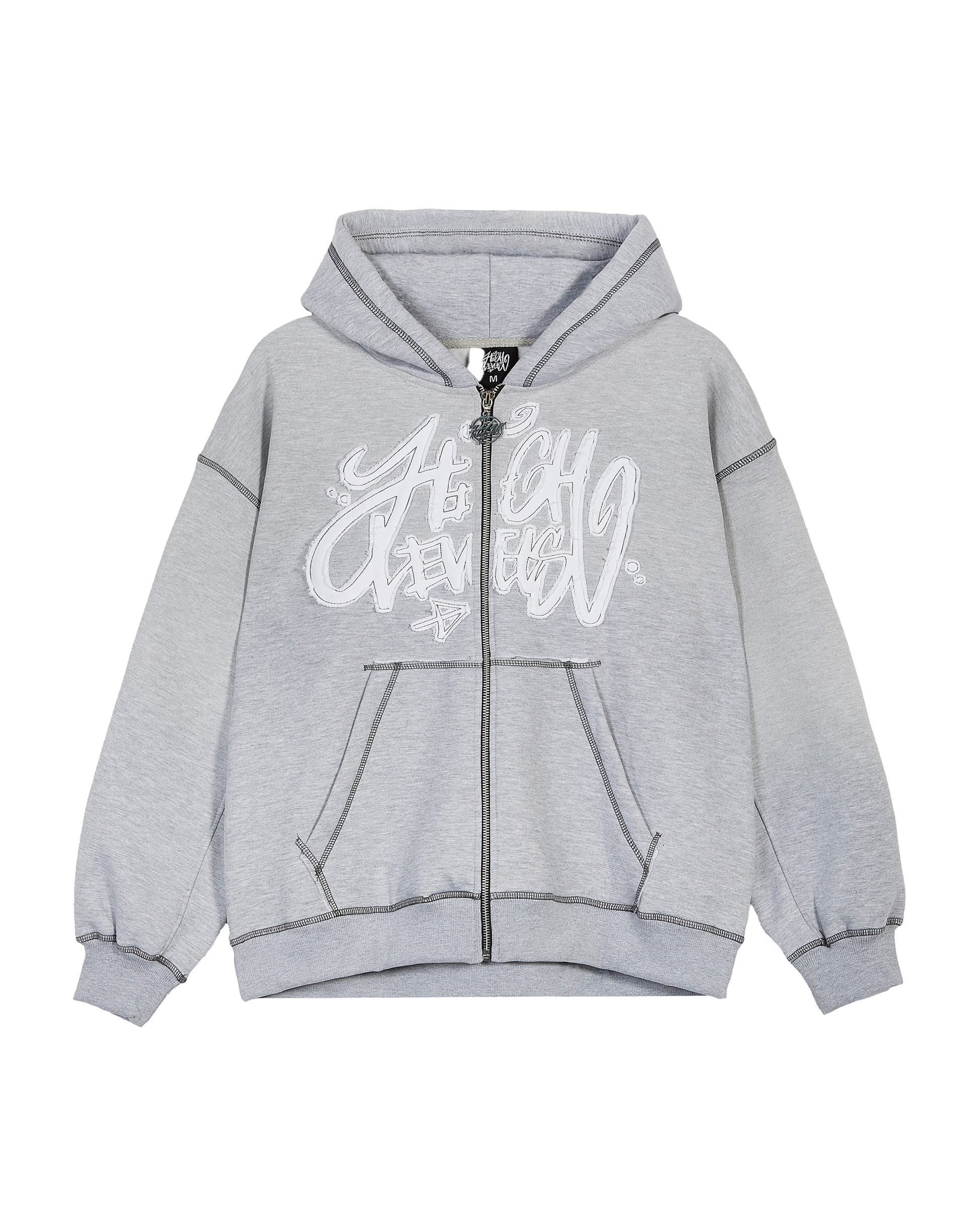 Oversized hoodie with distressed 3D embroidery, contrast stitching, and a sunwashed fade. Made from combed cotton fleece with a custom zipper for a relaxed, durable fit.