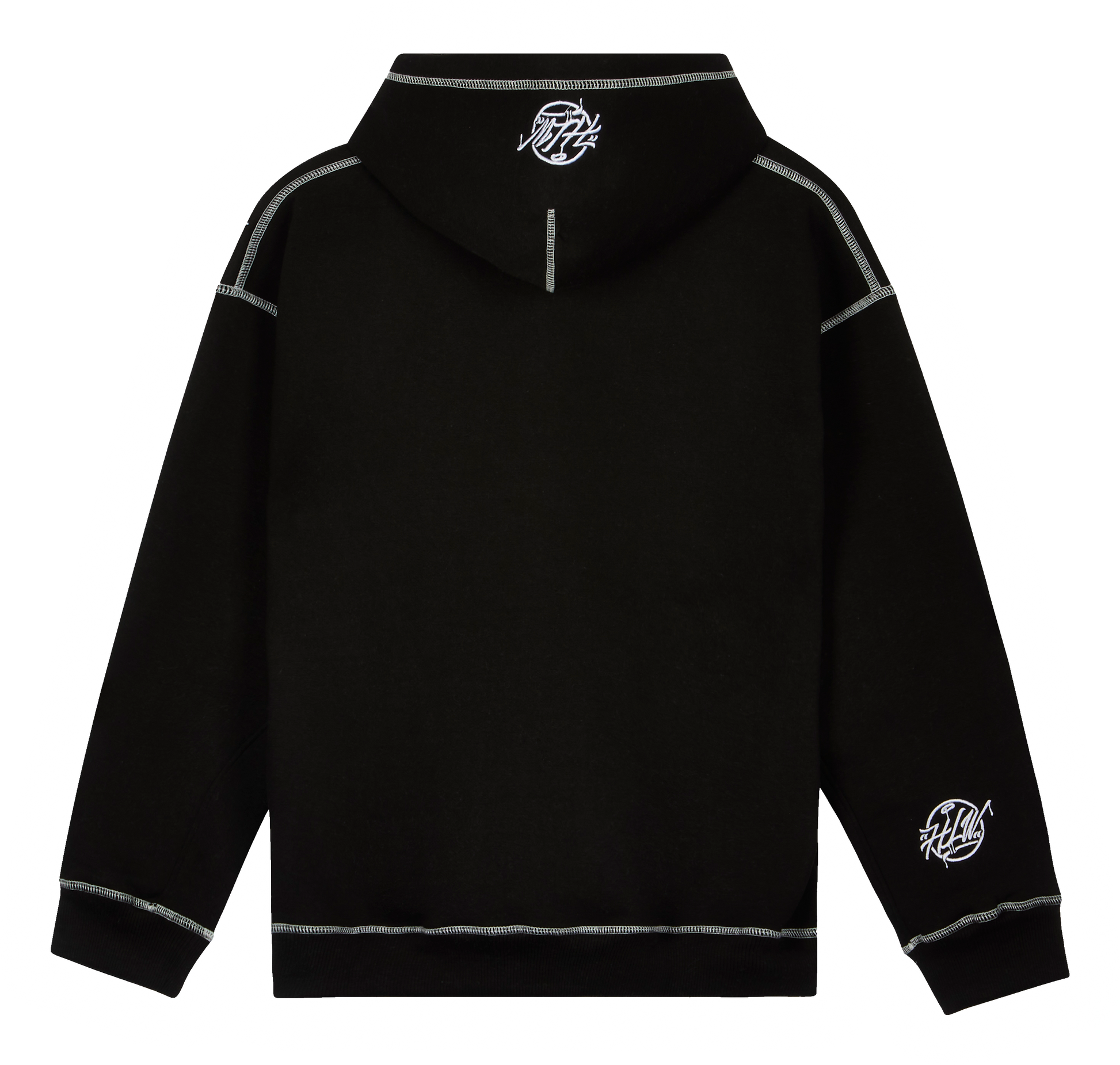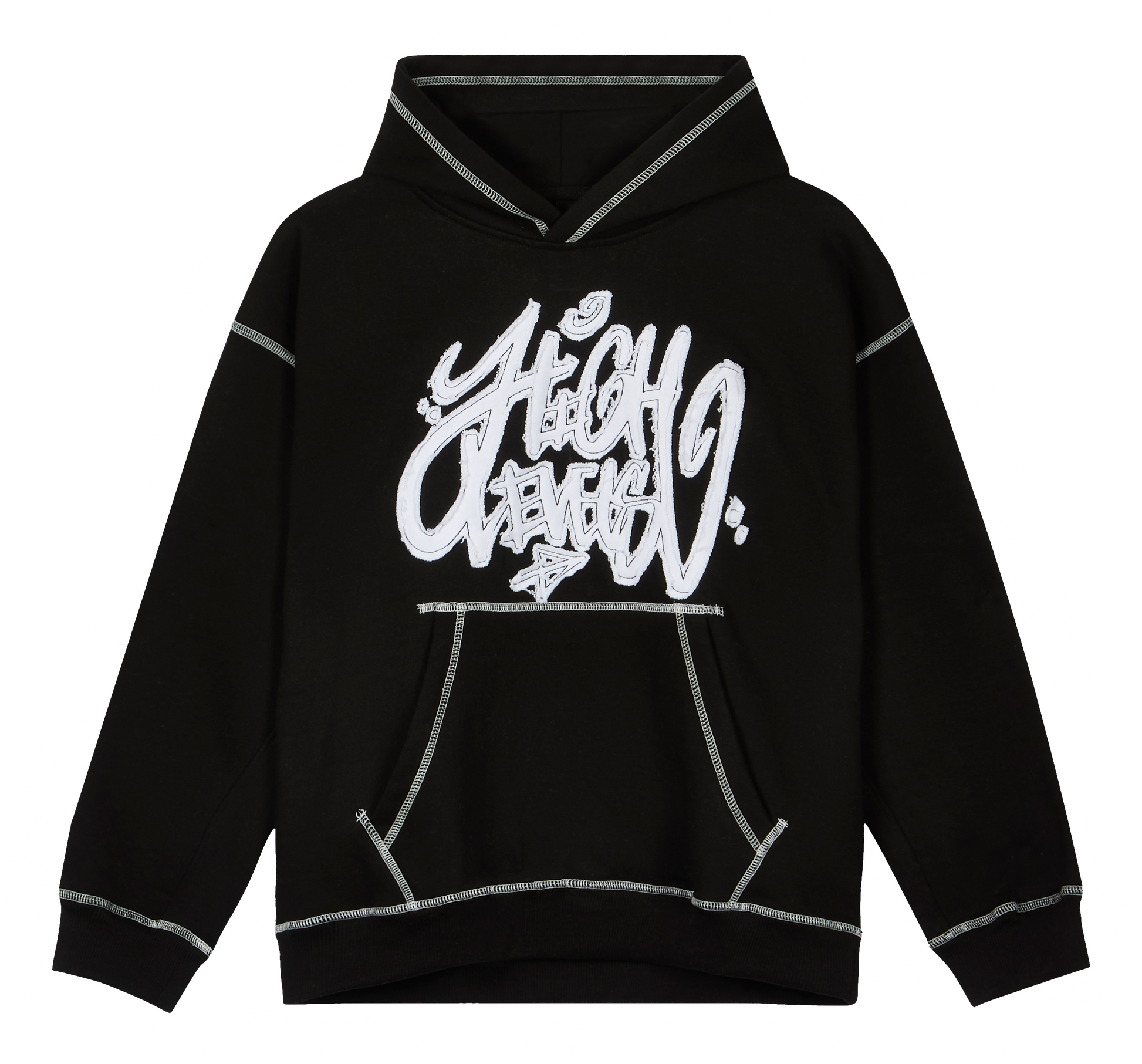 Oversized cotton fleece hoodie with distressed 3D embroidery and contrast stitching for a bold, relaxed fit.