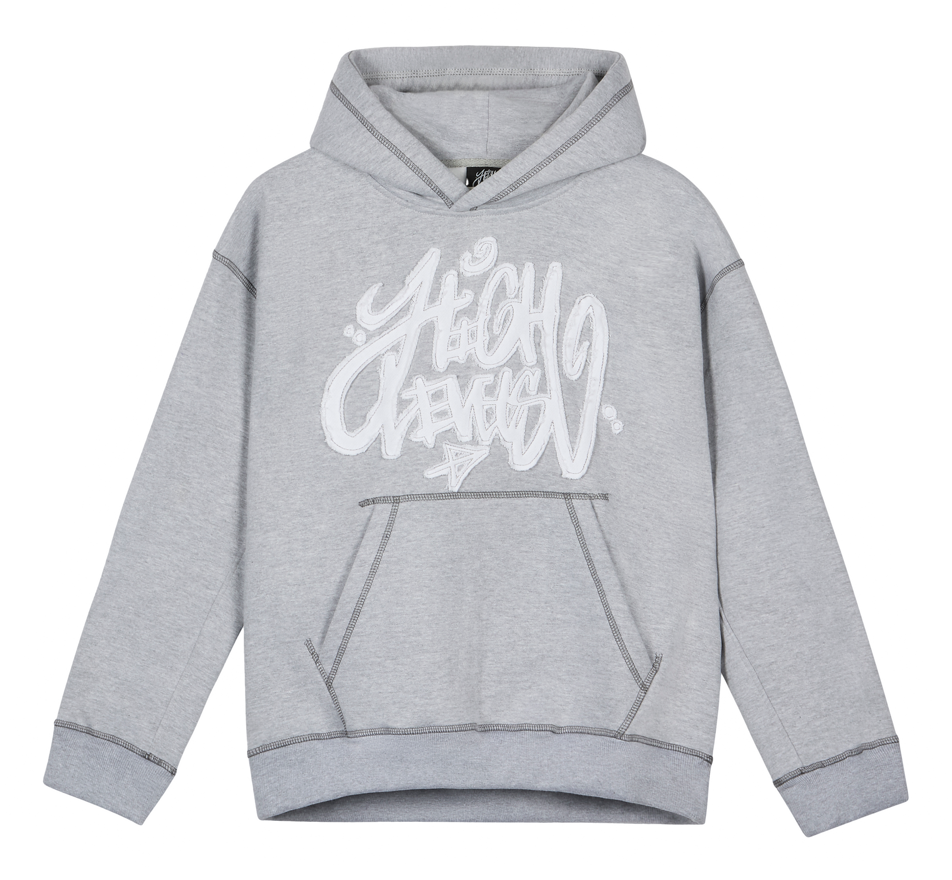 Oversized cotton fleece hoodie with distressed 3D embroidery and contrast stitching for a bold, relaxed fit.