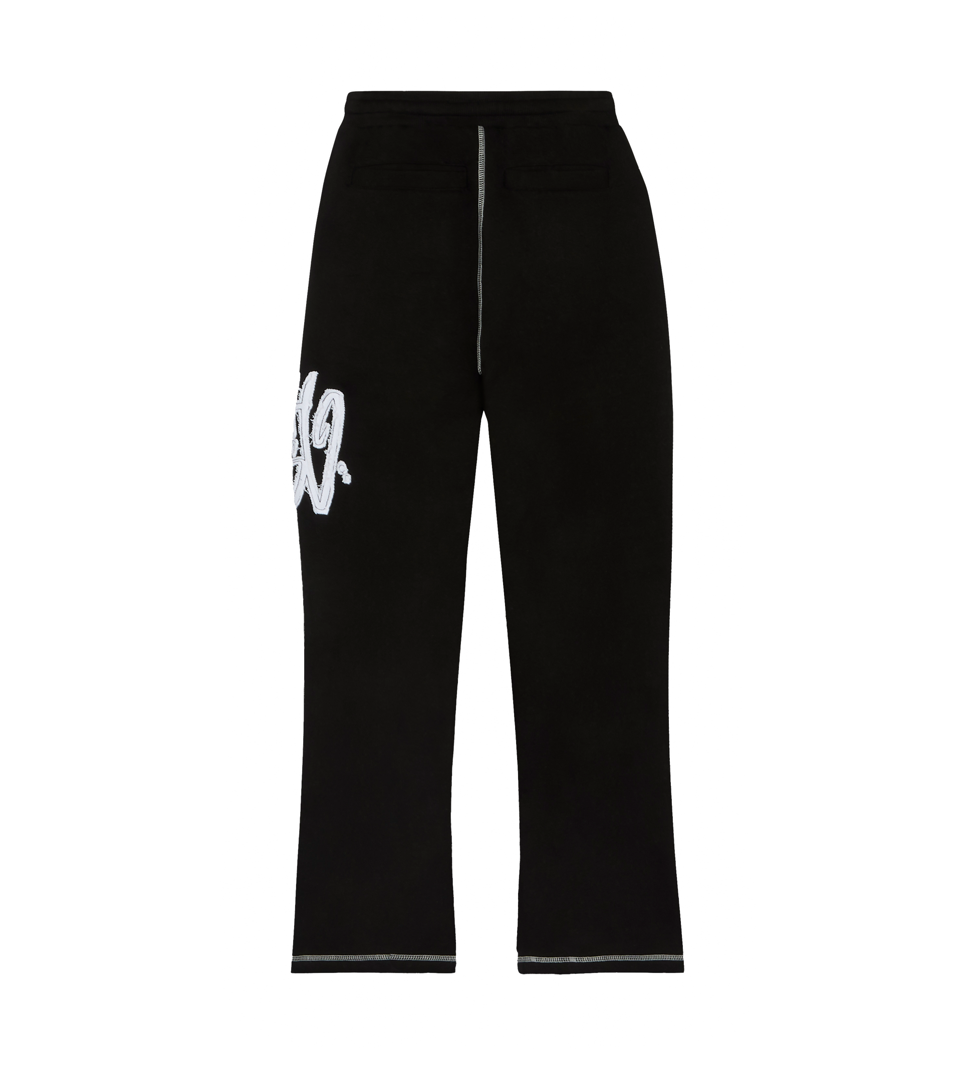 Oversized joggers with adjustable flared legs for a relaxed fit. Made from combed cotton fleece with distressed 3D embroidery and contrast stitching.