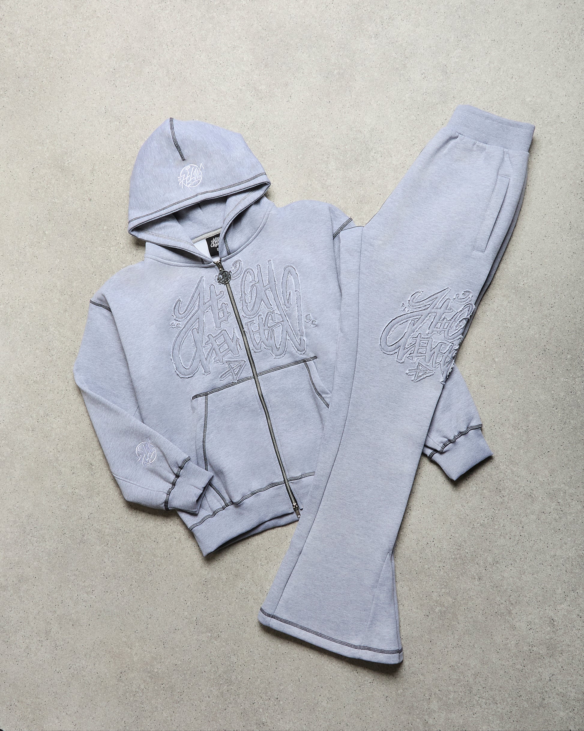 Structured hoodie with relaxed fit, distressed 3D embroidery, contrast stitching, and double zip with custom zip head.